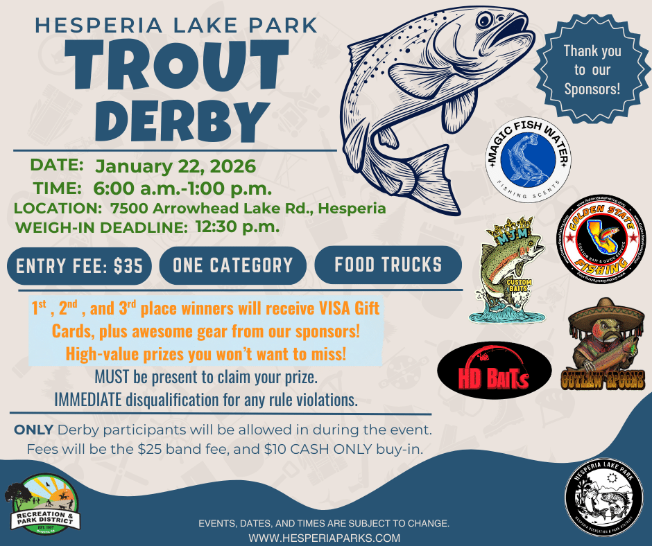 Jan 22 2026 Trout Derby 6:00 am - 1:00 pm Event Hesperia Lake Park 7500 Arrowhead Lake Rd., Hesperia Event Details Get Directions