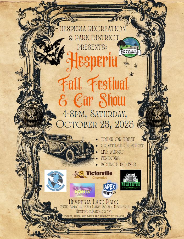 | FreeHesperia Fall Festival & Car ShowJoin us at Hesperia Lake Park on Saturday, October 25, 2025, from 4–8 PM for an evening of family fun!