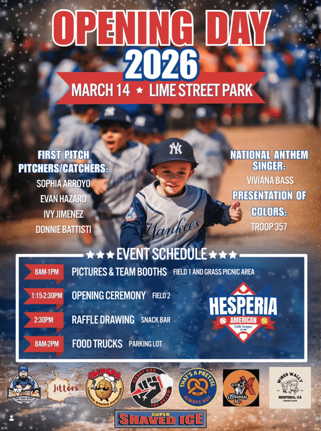 Mark your calendars for March 14 and come celebrate Opening Day with Hesperia American Little League: games, food trucks, raffles, and all the Little League magic!