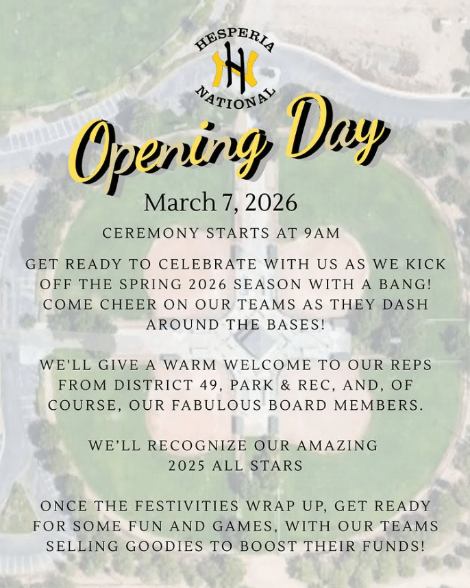 Mark your calendars for March 14 and come celebrate Opening Day with Hesperia American Little League: games, food trucks, raffles, and all the Little League magic!