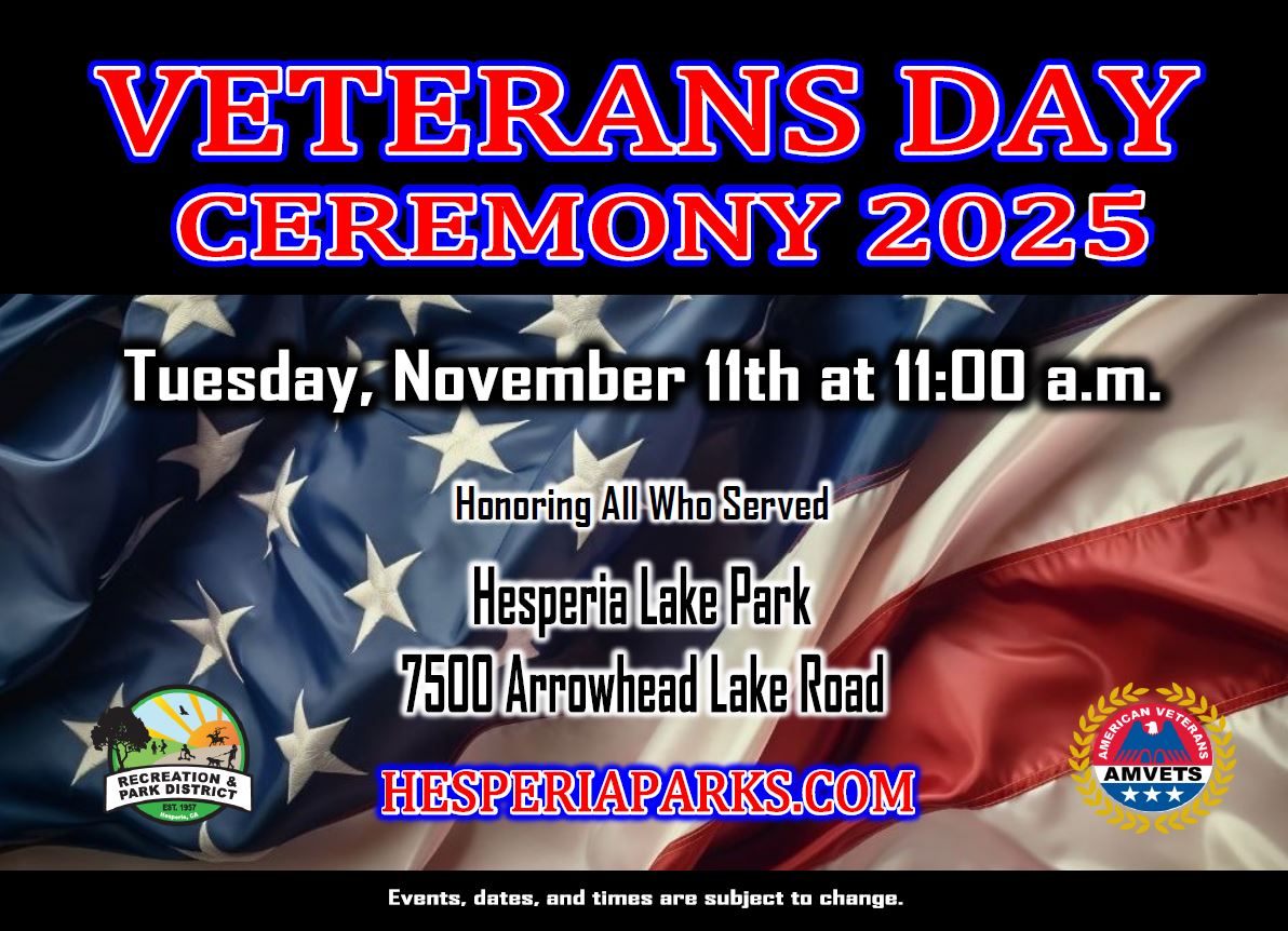 Our annual Veteran’s Day Ceremony will be at 11:00 a.m. on November 11, 2025 at the Veteran’s Memorial, located at Hesperia Lake Park, 7500 Arrowhead Lake Rd., Hesperia.